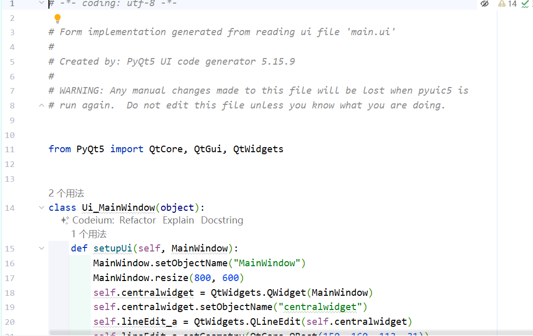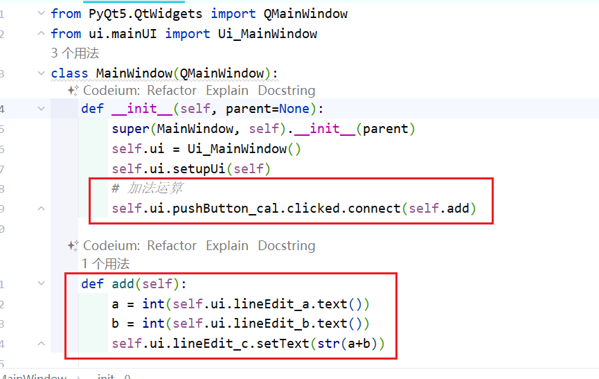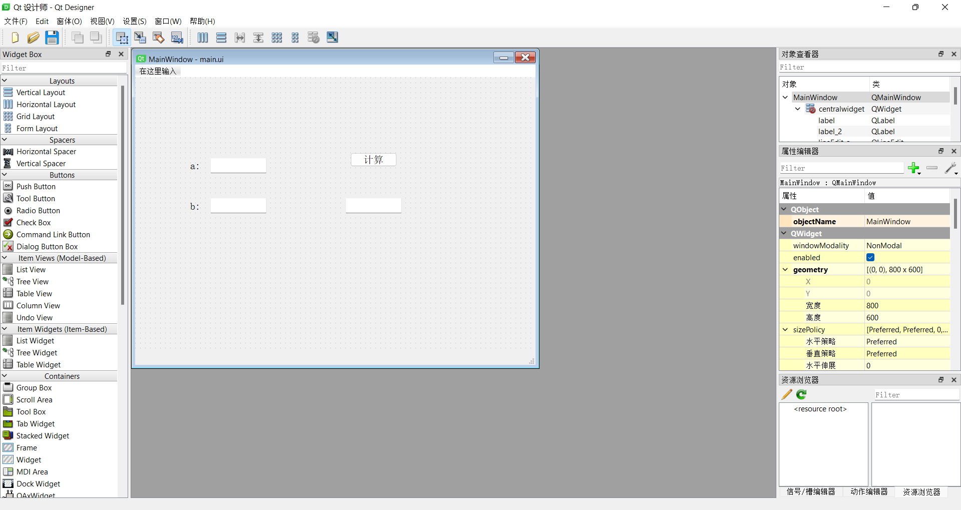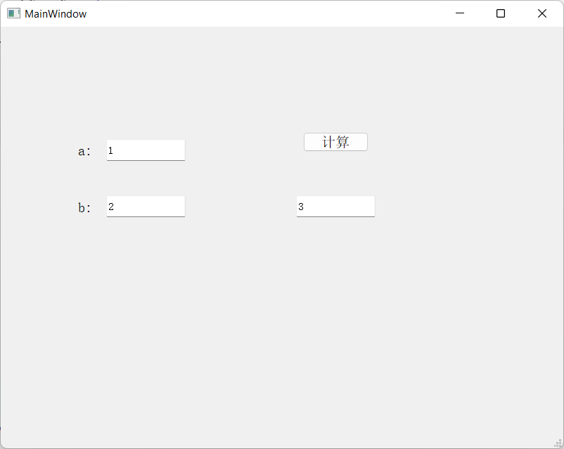 界面就可以在Pycharm中运行了,然后现在需要添加信号与槽连接,比如,我们想实现点击“计算”按钮后,右下角的框框为a和b的累加。