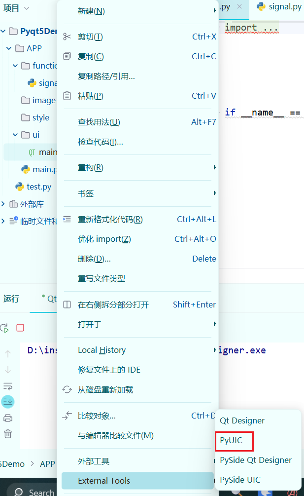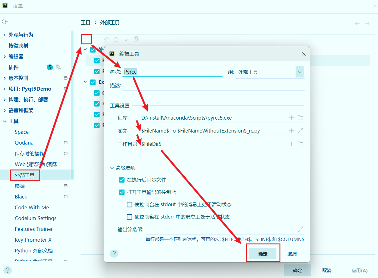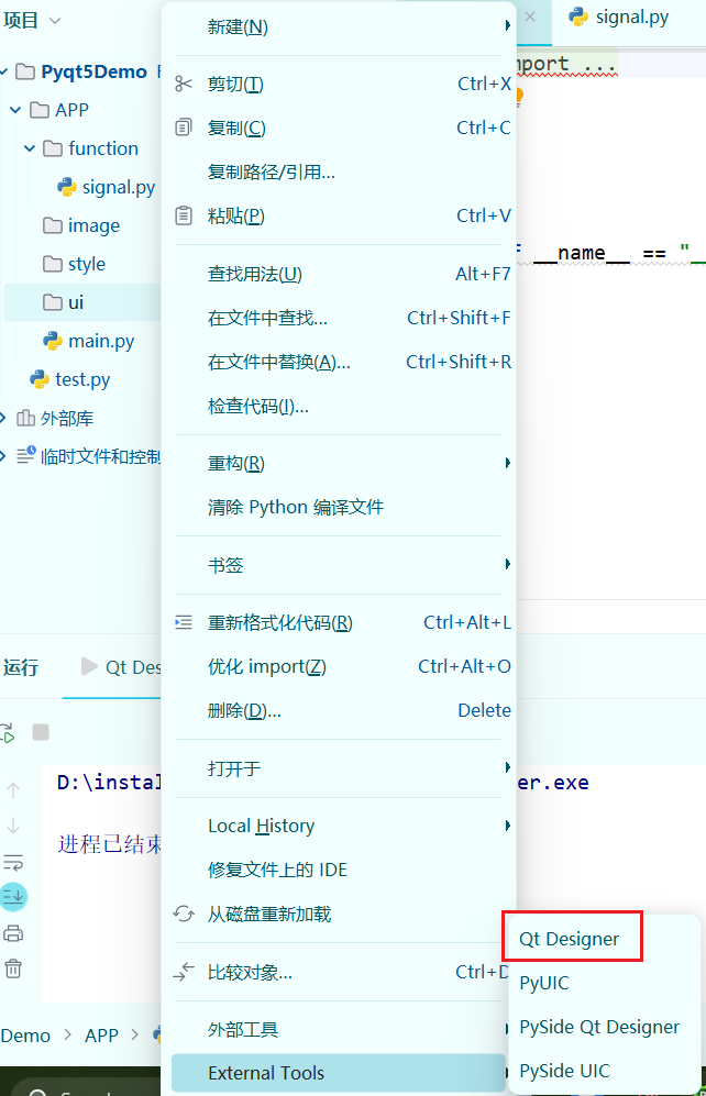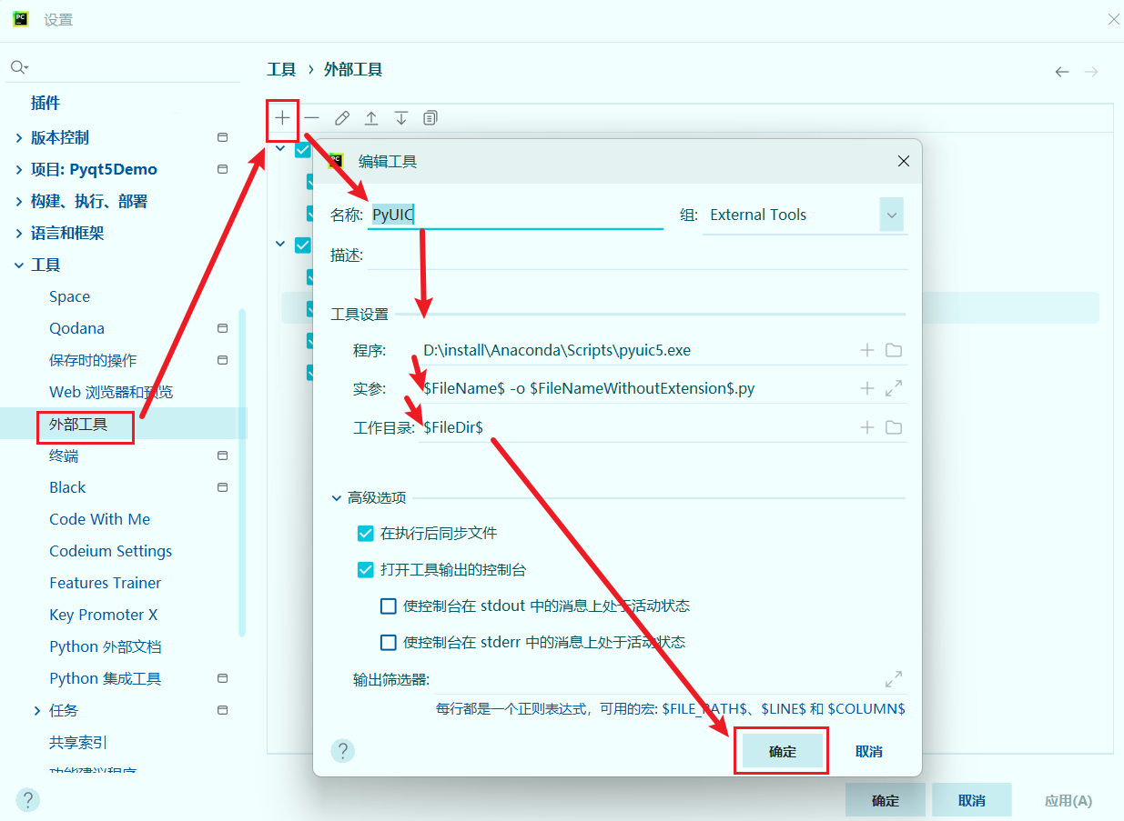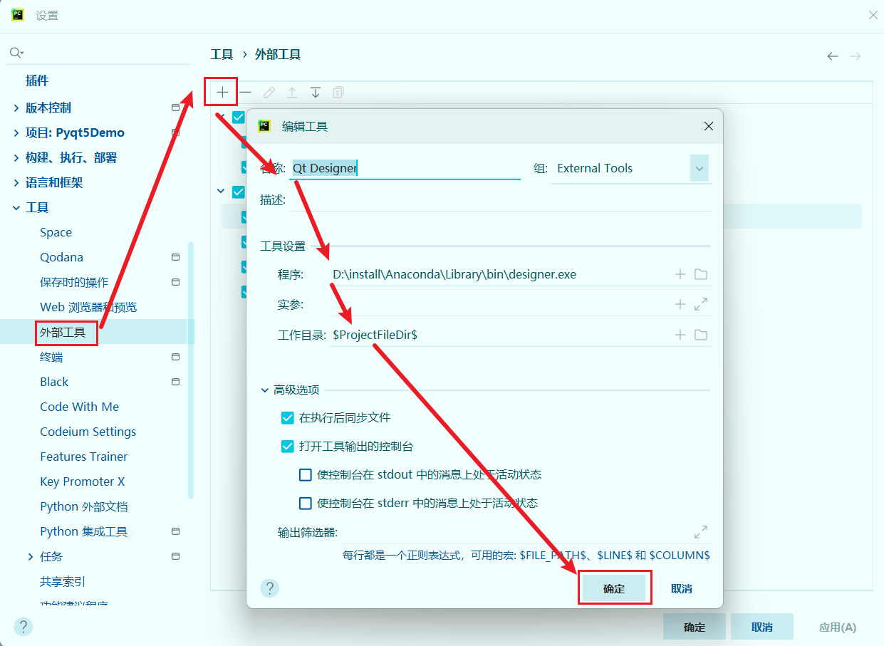pip install PyQt5-tools - 设置->添加外部工具Qt Designer
